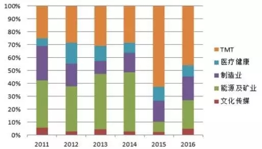 在國內(nèi) PE 投資方面,2016年TMT 行業(yè)投資熱度有所降低,但這與 2016 年市場整體投資節(jié)奏放緩有一定關(guān)系。如果從投資 的行業(yè)占比來看,TMT 和制造業(yè)仍然是最受投資機(jī)構(gòu)追捧的領(lǐng)域。