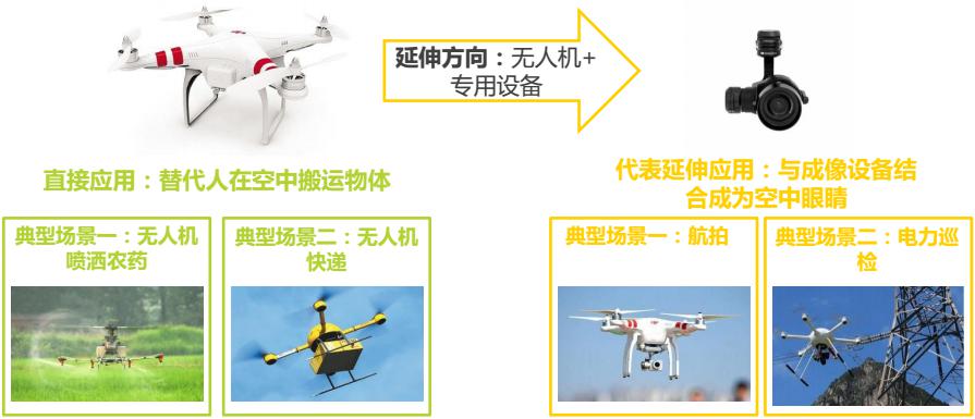 無人機價值在于替代人類完成空中作業(yè),并且能夠形成空中平臺,結(jié)合其他部件擴展應用。