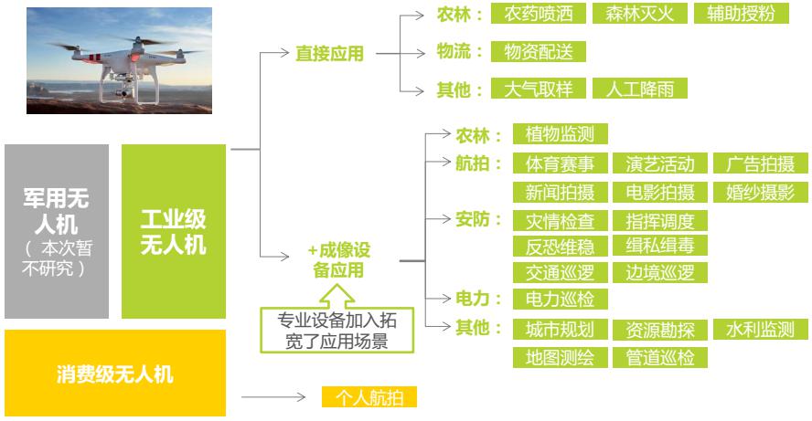 無人機即空中機器人,能夠替代人類完成空中作業(yè),同時與成像設備等部件結(jié)合能夠擴展應用場景,實現(xiàn)無人機+。