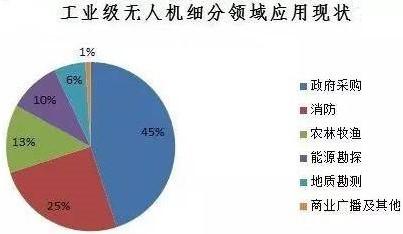 目前,工業(yè)級無人機細分領域中,政府采購占比45%,消防占比25%,農(nóng)林牧漁占比13%,能源勘探占比10%,地質(zhì)勘測占比6%,商業(yè)廣播及其他占比1%。
