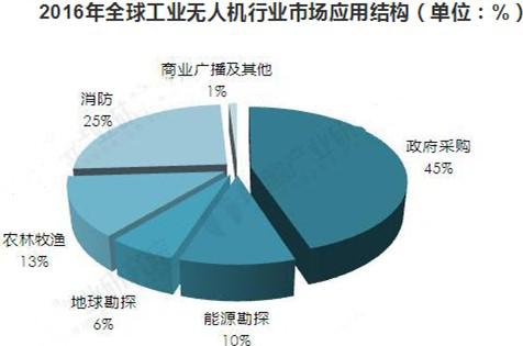 從應用結(jié)構(gòu)來看,當前全球工業(yè)無人機行業(yè)中45%為政府采購,能源勘探和地球勘探的應用占比分別為10%和6%,農(nóng)林牧漁的應用占比約為13%,在消防領域的應用占比達到25%。