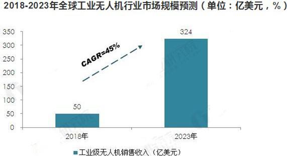 隨著工業(yè)級無人機技術的不斷發(fā)展,未來工業(yè)級無人機將呈爆發(fā)式增長。結(jié)合國際權(quán)威機構(gòu)對未來工業(yè)級無人機行業(yè)發(fā)展趨勢的判斷,預計到2023年,全球工業(yè)級無人機市場規(guī)模將超過300億美元。2018-2023年行業(yè)年均復合增長率將維持在45%左右。