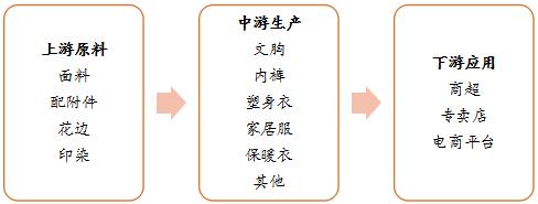萊卡內(nèi)衣上游原料主要有面料、附配件、花邊、丈根、印染,內(nèi)衣生產(chǎn)廠將這些原料經(jīng)過(guò)研發(fā)設(shè)計(jì),生產(chǎn)出相應(yīng)的內(nèi)衣產(chǎn)品:文胸、內(nèi)褲、塑身衣、家居服、保暖衣等。下游終端零售為:商超、專(zhuān)賣(mài)店、店商平臺(tái)。