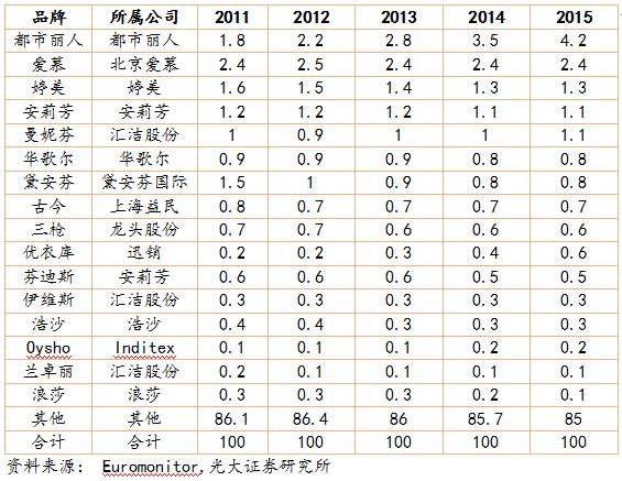 內(nèi)衣作為消費(fèi)者的第二層“肌膚”,消費(fèi)者對(duì)內(nèi)衣的消費(fèi)比其他成衣具備更強(qiáng)的忠誠(chéng)度,進(jìn)入 21 世紀(jì)后,消費(fèi)者對(duì)內(nèi)衣品牌的認(rèn)可也越來(lái)越強(qiáng)。 雖然部分品牌由于品牌老化導(dǎo)致市占率降低,但是總體看,前 16 家女士?jī)?nèi)衣品牌的市場(chǎng)份額從 2011 年的 13.9%提升到了 2015 年的 15%。前八大男士?jī)?nèi)衣品牌的市占率從 5.4%提升到 6%。