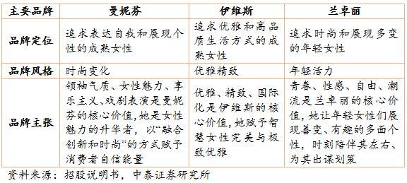公司實(shí)行多品牌運(yùn)作戰(zhàn)略,針對(duì)不同年齡段和不同風(fēng)格的消費(fèi)者推出三個(gè)中高端核心品牌“曼妮芬”、 “伊維斯”和“蘭卓麗”,三個(gè)副牌COYEEE、Bodybeauty 和喬百仕。其中,主打品牌“曼妮芬”連續(xù) 12 年市占率第一,其市占率長(zhǎng)期領(lǐng)先于規(guī)模最大的內(nèi)衣公司安莉芳的主品牌“安莉芳”。第二大品牌“伊維斯”連續(xù)兩年市場(chǎng)份額排名前十。