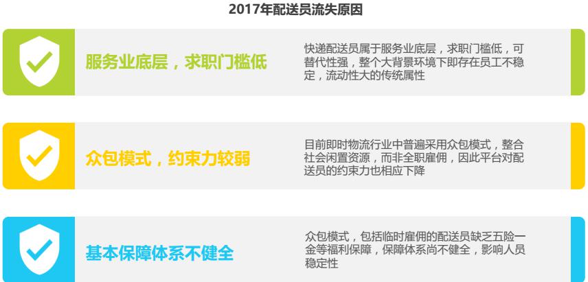 維持穩(wěn)定的配送員團隊,對于配送平臺的發(fā)展至關重要。但目前即時物流行業(yè)存在配送人員流失率高的難題。究其原因,存在以下三方面的因素:求職門檻低、可替代性強,平臺對人員的約束力較弱以及基本保障體系不健全。