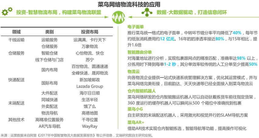 菜鳥網(wǎng)絡成立于2013年5月,定位于以數(shù)據(jù)驅(qū)動、社會化協(xié)同的物流及供應鏈平臺。主要業(yè)務有倉配網(wǎng)絡、跨境網(wǎng)絡、快遞平臺和ET.物流實驗室,以覆蓋全國的倉配網(wǎng)絡和大數(shù)據(jù)決策平臺為基礎,構建專業(yè)高效的供應鏈服務。為了提高網(wǎng)絡效率,一方面菜鳥以投資參股的形式構建菜鳥聯(lián)盟,另一方面加大科技研發(fā)的投入,積極布局智慧物流。