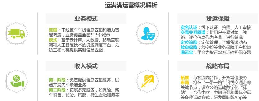 運滿滿成立于2013年,是基于云計算、大數(shù)據(jù)、移動互聯(lián)網(wǎng)和人工智能技術開發(fā)的貨運調(diào)度平臺,為貨主和司機提供實時信息匹配,減少貨運空載率、提高物流運行效率。由于模式相近,運滿滿被業(yè)界稱為“貨運版的滴滴”,成立3年來共獲得7輪融資,目前估值超過10億美金。截止2017年9月底,平臺實名注冊重卡司機400余萬、貨主100余萬,業(yè)務覆蓋全國 315 個城市。運滿滿最新推出擔保交易產(chǎn)品“滿運寶”,為貨運雙方提供運費擔保。此外,運滿滿還與阿里云、菜鳥、螞蟻金服、平安保險、中國聯(lián)通、中國重汽等開展深度戰(zhàn)略合作,通過跨界融合,不斷推出創(chuàng)新產(chǎn)品和服務。未來,運滿滿將借助人工智能、無人駕駛、區(qū)塊鏈等技術驅(qū)動,提供貫穿全產(chǎn)業(yè)鏈的線上線下服務,構建公路物流生態(tài)圈,打造綜合性的貨運平臺。