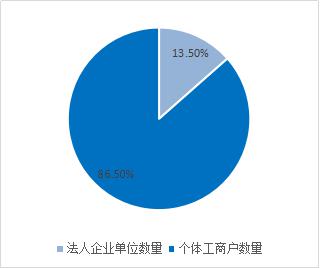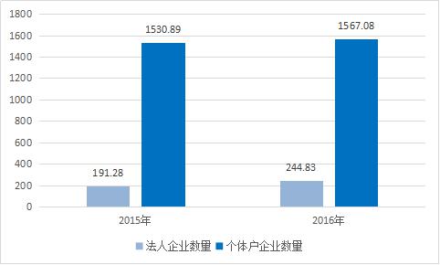 截至2016年底我國零售業(yè)經營單位共有1811.91萬個,同比增長5.2%。其中,法人企業(yè)單位數量為244.83萬個,同比增長28%,占全部經營單位比重為13.5%,比上年提升2.4個百分點;個體工商戶數量1567.08萬個,同比增長2.4%,占全部經營單位比重為86.5%。