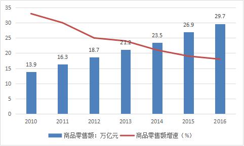 2016年我國商品零售額為296518億元,同比增長10.4%,增速比上年降低0.2個百分點,降幅比上年收窄1.4個百分點。