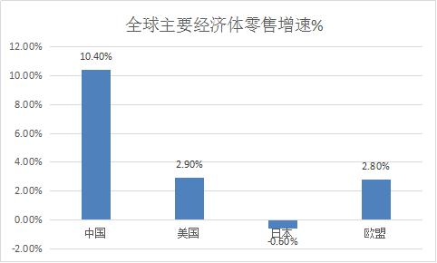 2016年我國商品零售額增速仍處于較高水平,分別比美國、日本、歐盟高7.5、11和7.6個百分點。