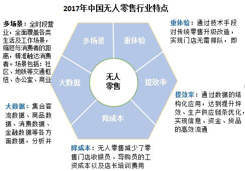 當前中國無人零售行業(yè)主要呈現五大特點:以降低人工成本作為無人零售的主要切入點,在重視消費體驗,拓展零售場景的同時通過多種技術手段實現大數據的收集、分析與應用,并最終實現消費流程的全面數據化以及整個產業(yè)鏈的智能化升級提效。