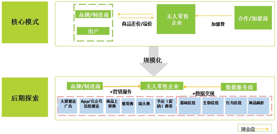 無人零售企業(yè)收入來源以銷售商品賺取差價為主,并且通過規(guī)?;岣咦h價能力降低采購成本。此外,從加盟商獲取加盟費用的商業(yè)模式也已經開始推行。無人零售發(fā)展至中后期,企業(yè)數據更為龐大,其盈利模式將隨之產生更多的想象空間,以互聯網思路開展營銷服務、數據變現等都是比較成熟的可參考模式。