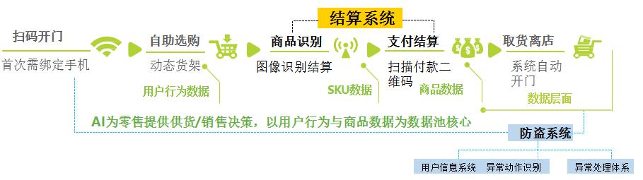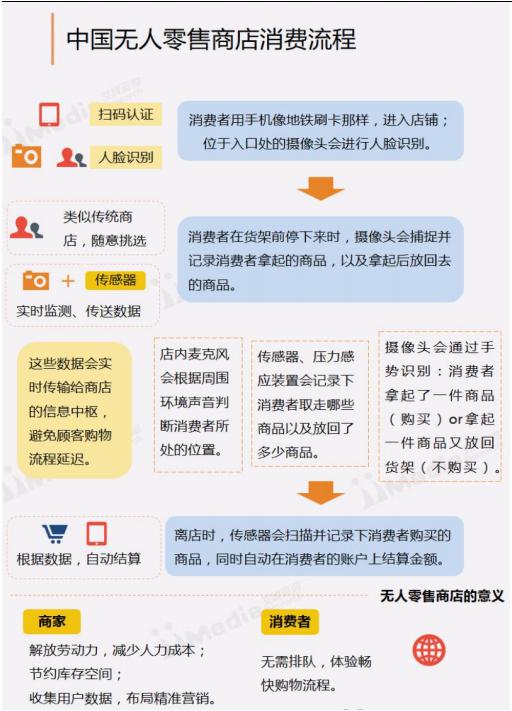 國內目前的無人零售店的消費流程主要分為:掃碼認證或人臉識別、挑選商品、根據數據自動結算這些環(huán)節(jié)。對于商家而言,可以節(jié)約人力成本和沉淀消費數據,對于消費者而言,則可以增強體驗感和減少排隊時間。
