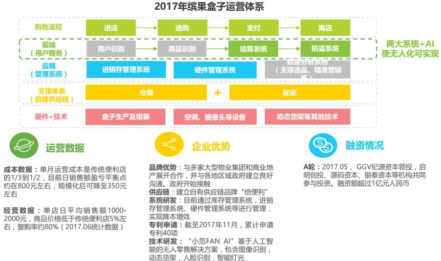 ? 無人開放式貨架,主要設置在辦公空間,消費者自取商品并通貨架上二維碼支付,典型代表包括猩便利、零食e家、用點心吧等。相比于自動售貨機,開放貨架成本低(自動售貨機單機成本2~2.5萬、放開貨架成本100~300元),一般無入駐租金,缺點是丟失率難控制。例如猩便利每個貨架可以放置 40多個SKU、300件商品,最高可達每日補貨,已經入駐強生、中國平安、美團點評、優(yōu)客工場、分期樂等企業(yè);