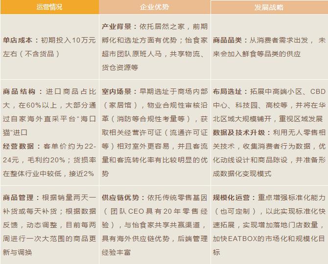 EATBOX由居然之家于2017年7月推出,定位于中高端小區(qū)、高校、CBD及科技園等。EATBOX 首店面積約30平米,設有9個貨架、2臺冰柜,主要銷售零食、飲料酒水、日化等商品,SKU約600~700個,進口商品SKU約400個。