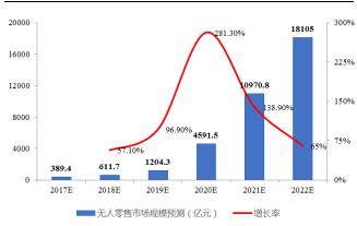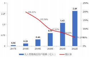 據艾媒咨詢預測,2017年我國無人零售商店交易額預計為389.4 億元,未來五年無人零售商店將會迎來發(fā)展紅利期,2020年的預計增長率可達281.3%,至2022年市場交易規(guī)模將超過1.8萬億元。同時,艾媒咨詢預計,2017年我國無人零售商店的用戶規(guī)模僅為600萬人,未來五年用戶規(guī)模將大幅增長,至2022年可達2.45億人。