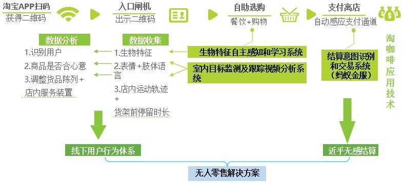 2017年7月阿里巴巴在淘寶造物節(jié)上推出無人便利店淘咖啡。淘咖啡經營面積約200平米,分成超市區(qū)(無店員)和餐飲點單區(qū)(有少量店員),可一次性容納客流50人左右。消費者通過手機淘寶 APP 掃碼進店,選購完成后需通過兩道結算門,當第一道門感應到消費者的離店需求時即會開啟,消費者走出第一道門后,系統(tǒng)會自動對所購買商品進行識別與結算,結算完成后第二道門自動打開,消費者離店。