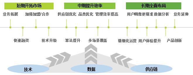 中期:企業(yè)的運營重點在于供應鏈與管理效率的提升,包括企業(yè)進行技術算法提升,并將供應鏈進行網狀轉變,同時擴充或開發(fā)零售多場景,覆蓋主要消費場景,品類、商品組合進入精選模式,根據不同用戶個性化/精準化推送等。