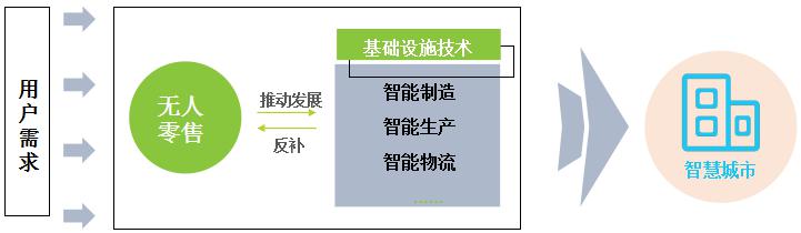 以無人店和開放貨架為代表的無人零售市場雖然才剛剛開始,在政策不斷規(guī)范并且進一步鼓勵無人零售業(yè)態(tài)發(fā)展的環(huán)境和數據、技術、供應鏈等多環(huán)節(jié)共同促進下的情況下,無人零售市場三大業(yè)態(tài)相互配合且與傳統(tǒng)業(yè)態(tài)緊密融合。無人零售用戶消費習慣將逐漸被培養(yǎng)成熟并且倒逼傳統(tǒng)市場不斷改革(降本增效、提升體驗),無人零售帶動智能制造、智能物流等基礎設施技術不斷發(fā)展突破,無人便利店,無人倉庫,無人機等之間相互配合,全鏈條智能化空間進一步提升。這些技術的突破又將反補無人零售行業(yè)的發(fā)展,人們生活便捷度進一步提升,成為推動智慧城市發(fā)展的要素之一。