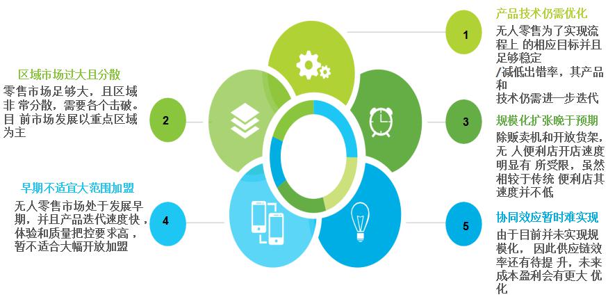 無人零售市場整體看好,但發(fā)展仍受到一定困阻典型優(yōu)質企業(yè)能夠起到很好的示范作用,整體無人零售市場有發(fā)展前景。但目前來看,不容忽視的是市場剛剛經歷一年左右的發(fā)展,還處于前期探索階段,因此還存在一些比較共性的發(fā)展困阻,主要集中在產品技術優(yōu)化、區(qū)域市場拓展、企業(yè)規(guī)模化發(fā)展、企業(yè)開放加盟和供應鏈的協同效應。